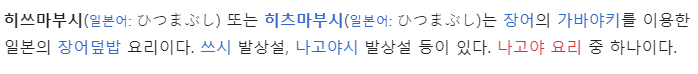 위키백과, 우리 모두의 백과사전. 히쓰마부시 히쓰마부시(일본어: ひつまぶし) 또는 히츠마부시(일본어: ひつまぶし)는 장어의 가바야키를 이용한 일본의 장어덮밥 요리이다. 쓰시 발상설, 나고